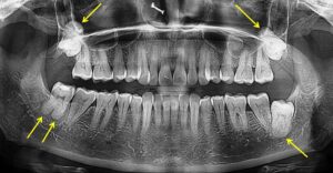 Figure 1: Orthopantomograph showing localized Cemental Hyperplasia or Hypercementosis involving roots of all four third molars (yellow arrows)